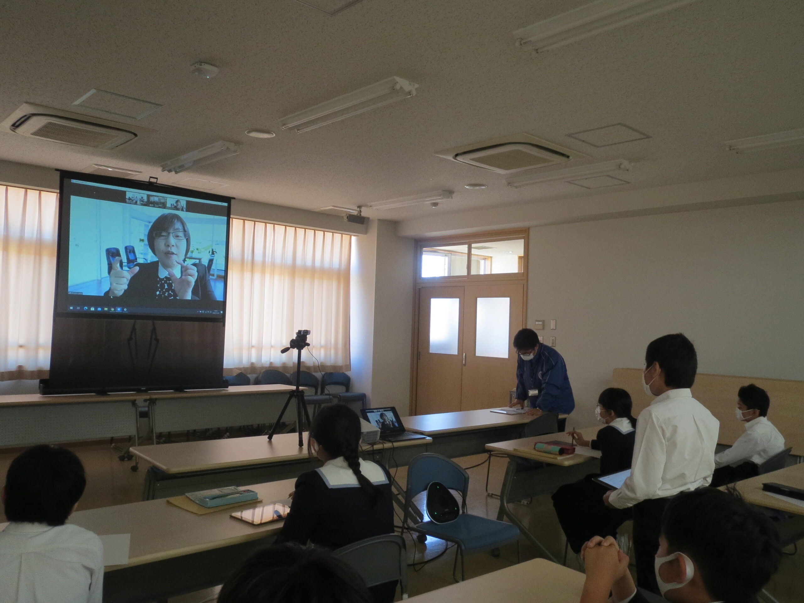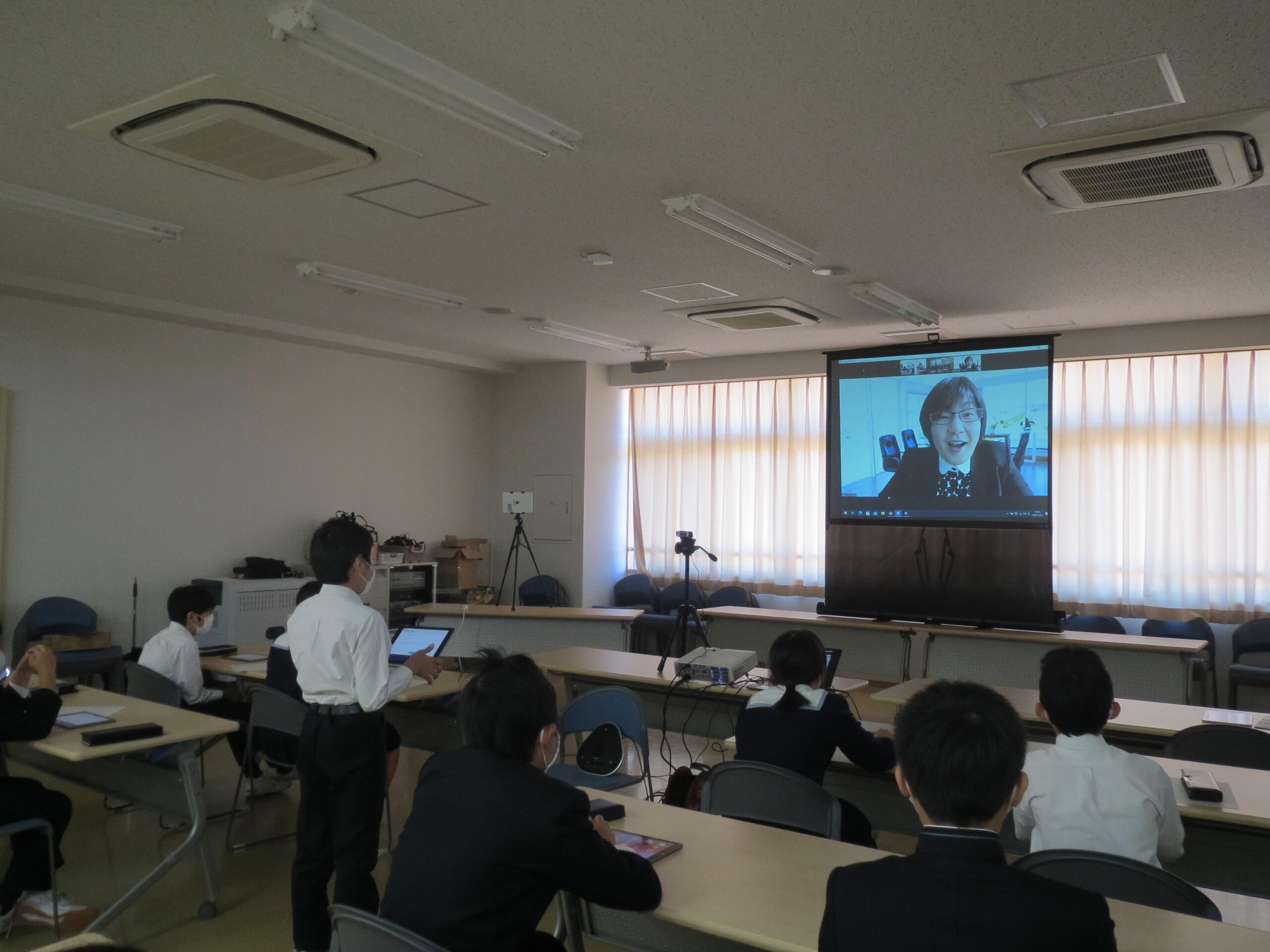 一か月前、大阪工業大学 ロボティクス&デザイン工学部の上田悦子先生に、遠隔授業でプログラミングについていろいろな話を聞いたM2(小学6年)生の子どもたちです。その時にもった質問を先生に教えてもらえる遠隔授業パートⅡを行いました。