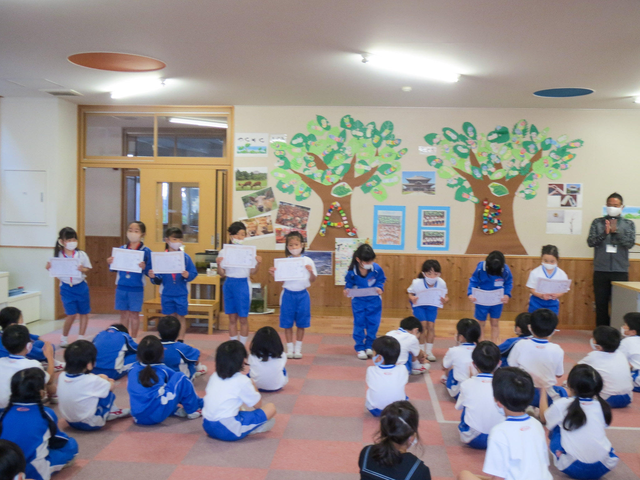 別の日に、分散して表彰式を行いました。P1、P2はそれぞれ学年のオープンスペースで、P3とP4学年、M1とM2学年は2学年がP体育館に集まって表彰式です。前に出て表彰される子。前には出ないけど自分もやりきった顔で拍手を送る子。