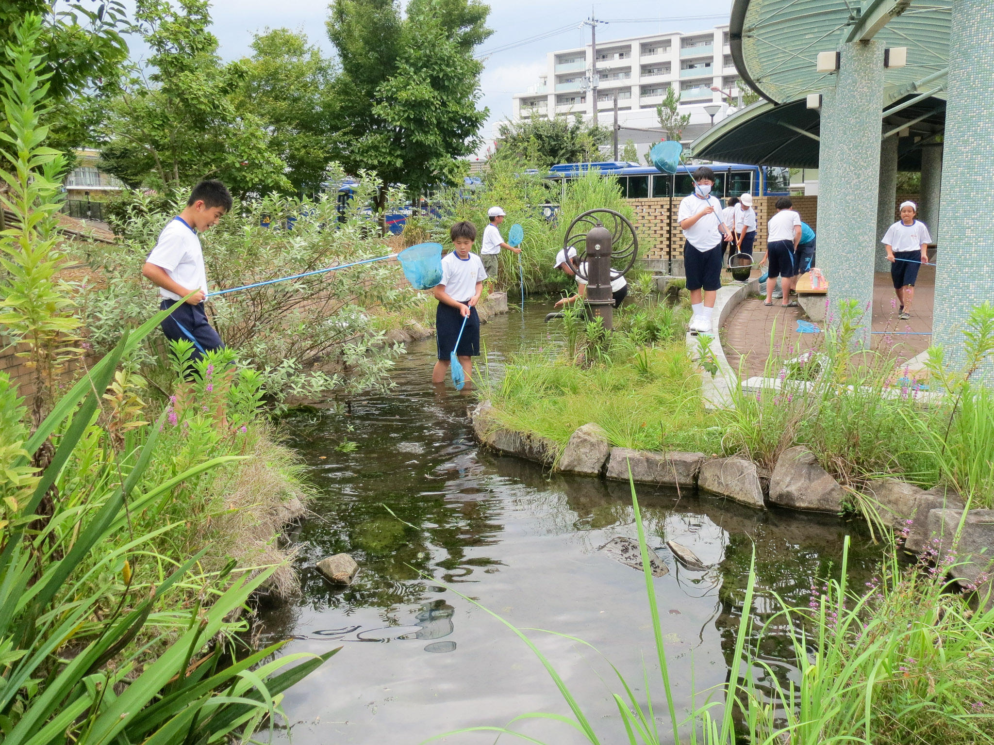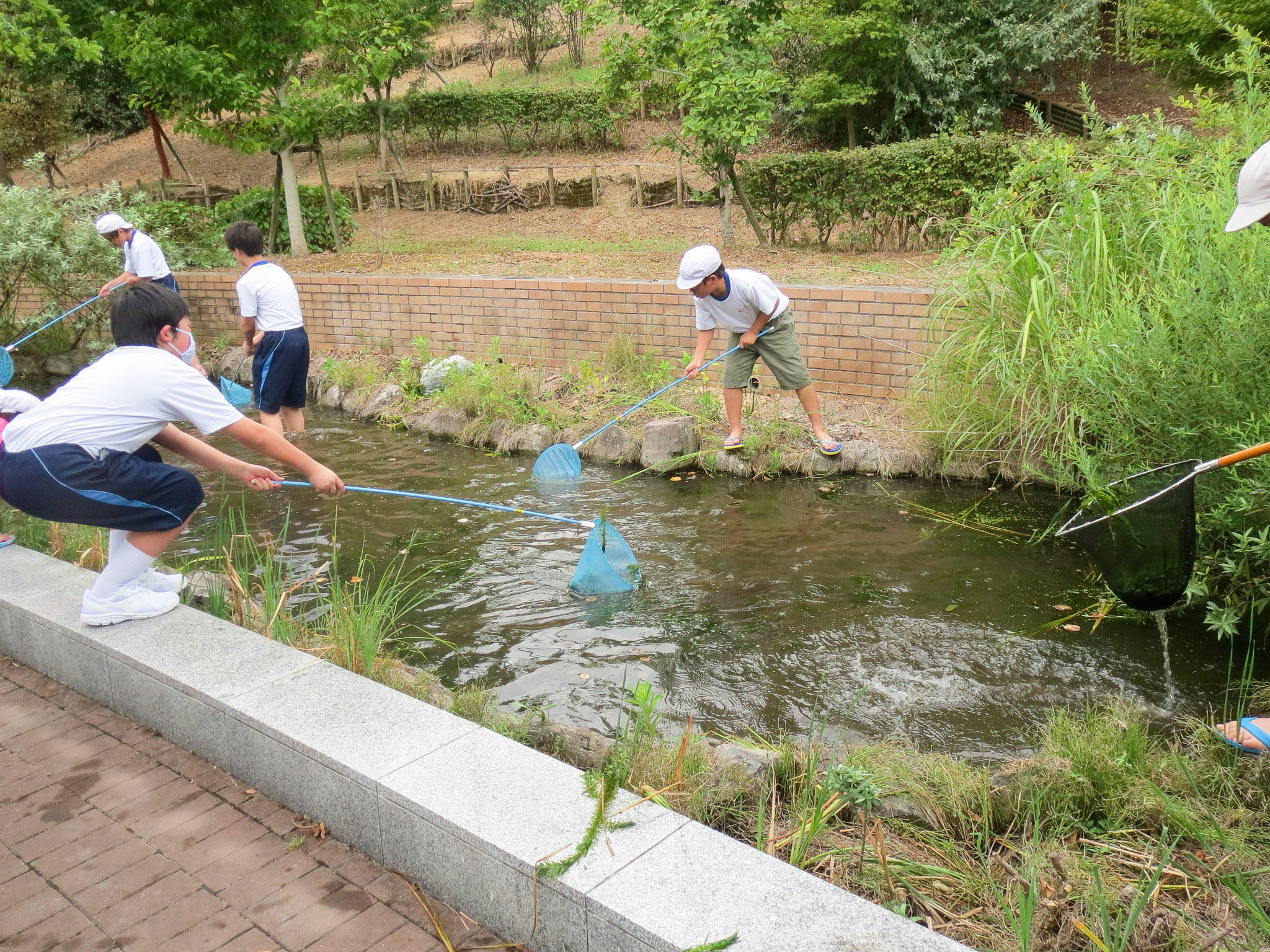 でも、オオカナダモがたくさん繁殖してしまい、清掃が必要になってきました。そこで、小学校のP4~M2(小学4年~6年)生で構成される環境委員会の活動で池と水路の清掃をしてくれました。委員会活動は、学校の中で必要になる仕事を子どもたちが分担して動いてくれる活動です。
