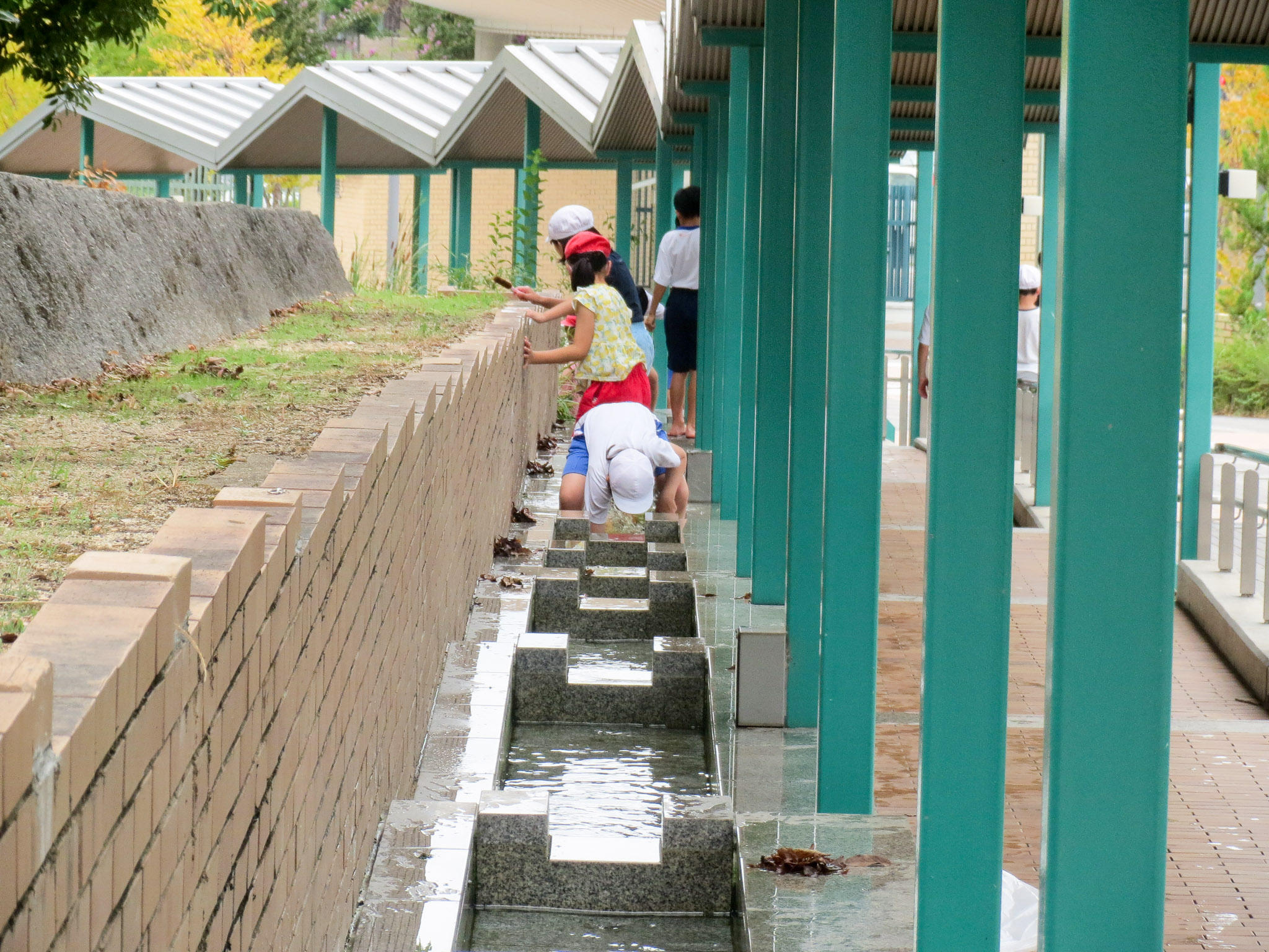 9月の活動日。汚れてもいい服装に着替えて、網をもったりたわしをもったりして一生懸命に掃除する子どもたちです。たくさんのオオカナダモを池から出したり、水路をたわしでこすってきれいにしてくれたりしてくれたおかげで、随分きれいになりました。