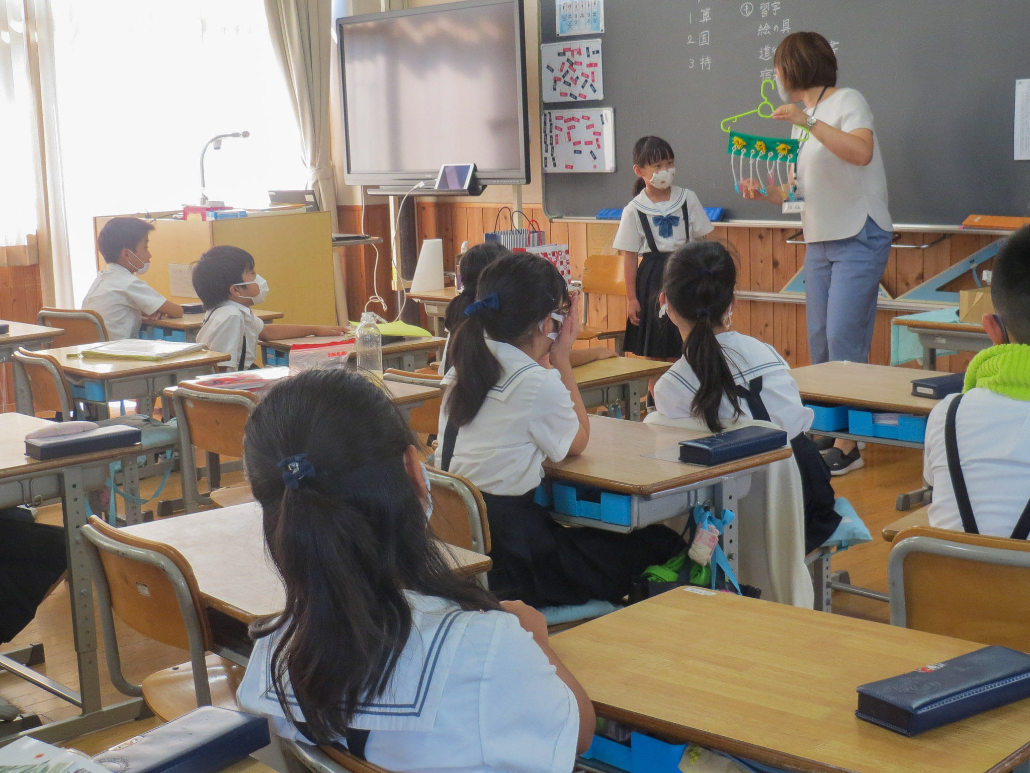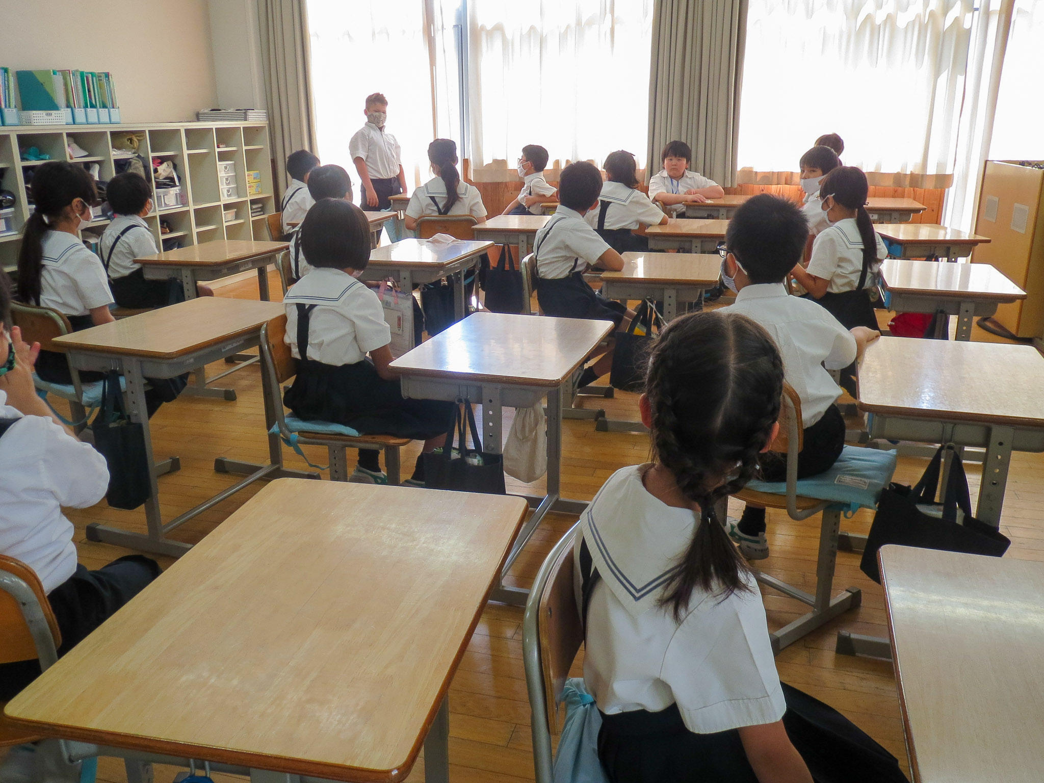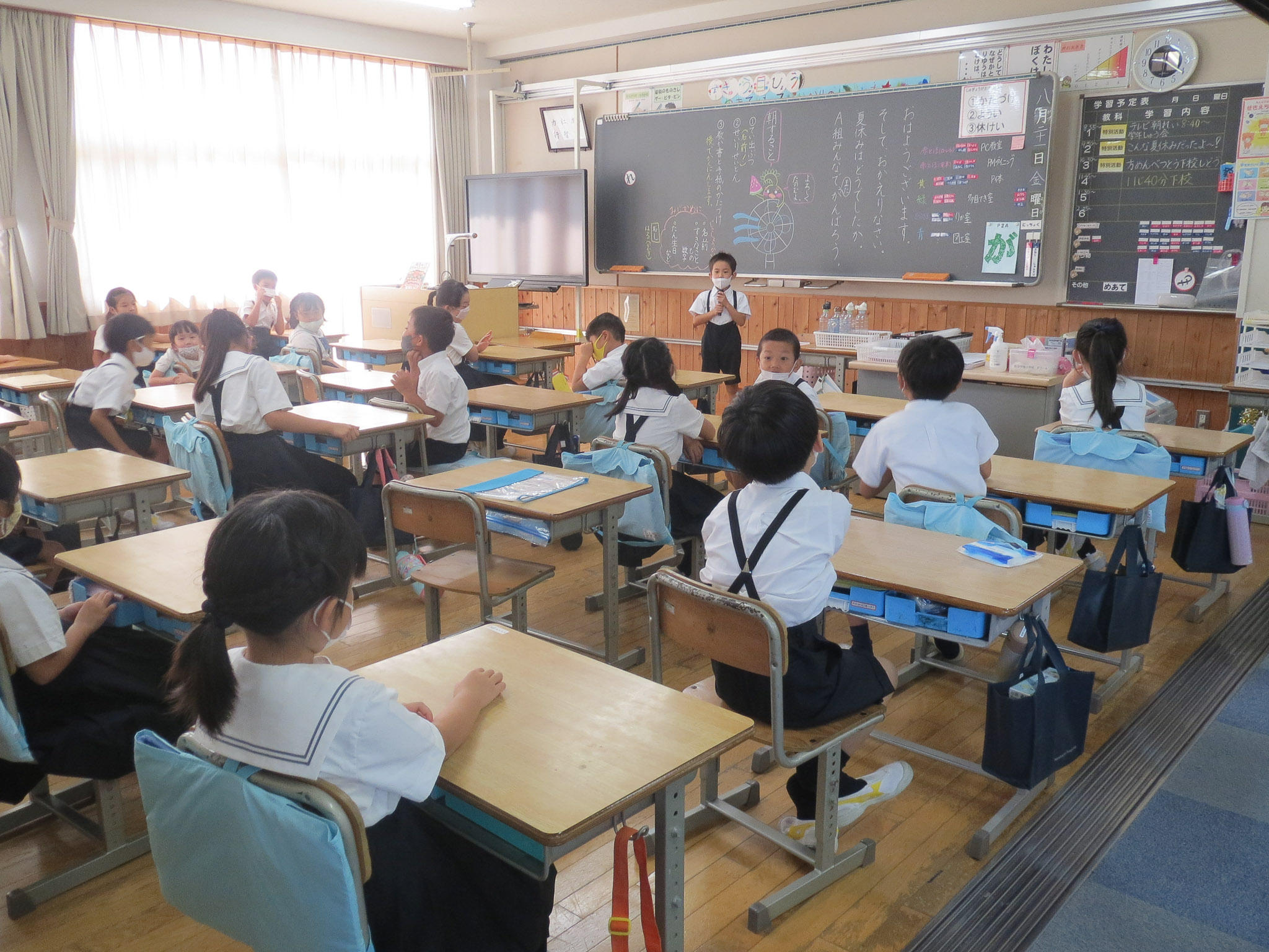 各クラスの学級活動の様子を見ていると、転入生が来てくれて自己紹介をしているクラス、休み中の出来事を発表しているクラス、作ってきた作品を友だちに見てもらっているクラス…。久しぶりに会った友だちと楽しい会話が弾んでいました。