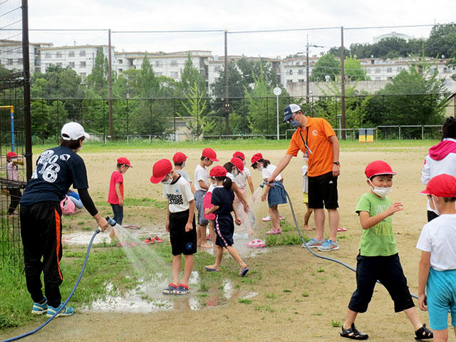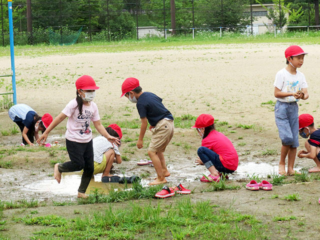 汚れても大丈夫な服に着替えて校庭に出た子どもたち。水たまりに入ったり、泥団子を作ったり…。きっと、入学前に幼稚園や保育園などでも経験したことがあるのかもしれません。ちょっぴりぬれてしまうこともおかまいなしで、楽しむ子どもたちです。