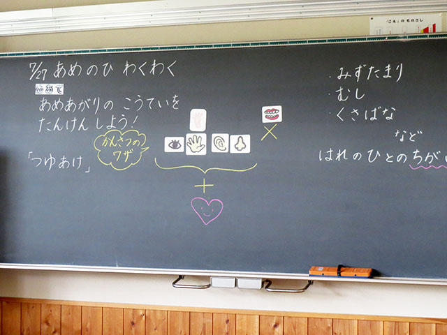 クラスに帰ってから、雨の日と晴れの日の違いについて発見したことを「あめの日わくわく」の振り返りカードに一生懸命書いていました。