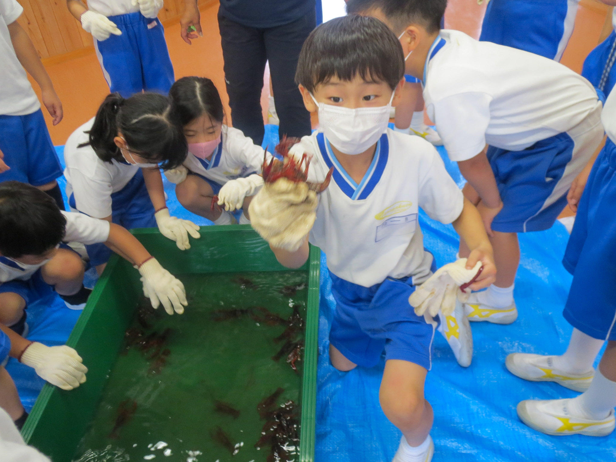 ザリガニさんをまだ触ったことがない子も、触ったことがある子も、みんなでザリガニさんを手に持ちました。素手で持てる子は素手で、難しいなという子は軍手をして。みんなの雰囲気が持ちたい!となっているので、嫌がる子は誰もいません。