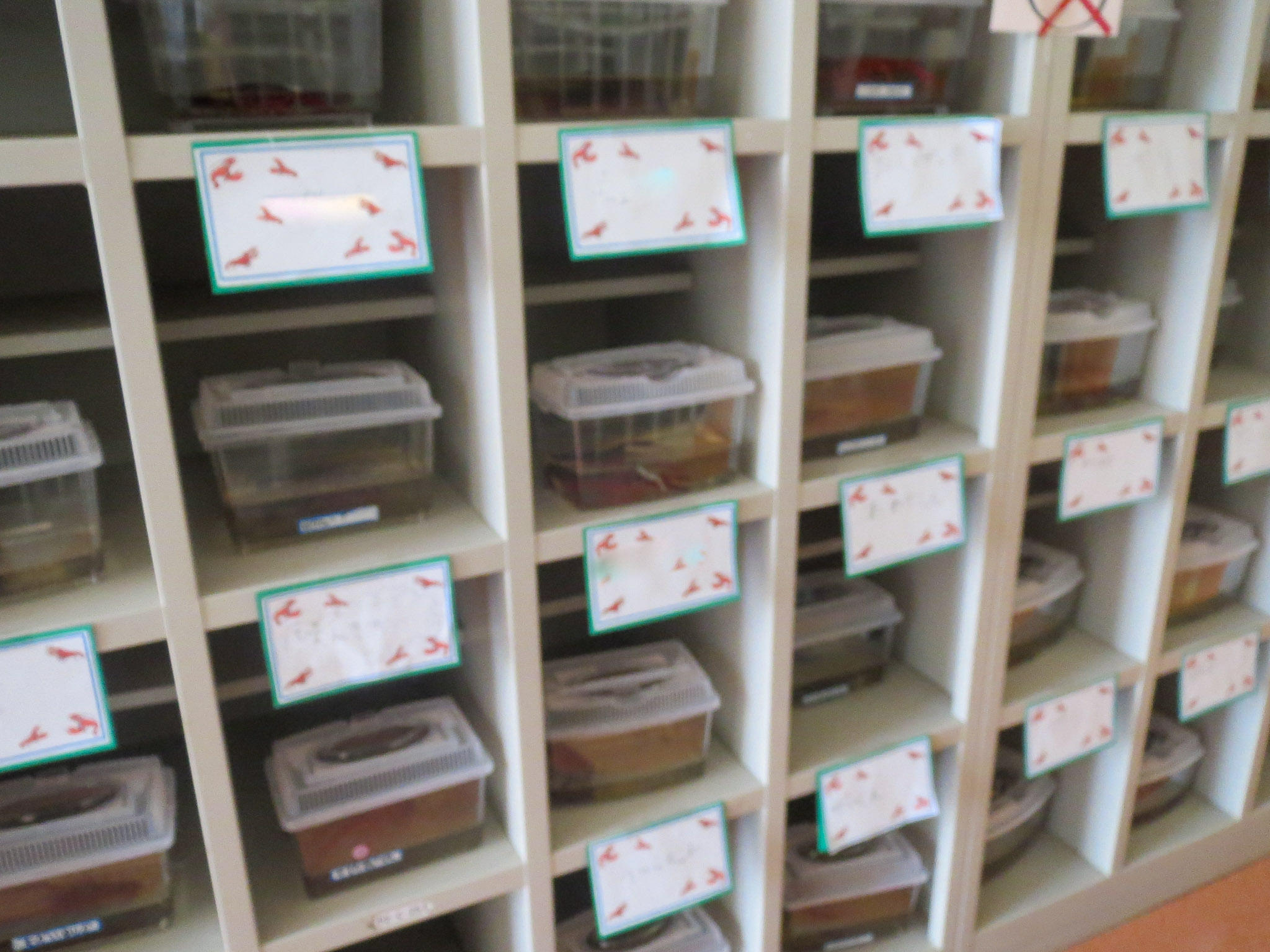 一人一人のザリガニくんは、今、靴箱を使ったザリガニマンションにすんでいます。毎朝水を取り替えて、えさをあげて、お世話をしている子どもたちです。
