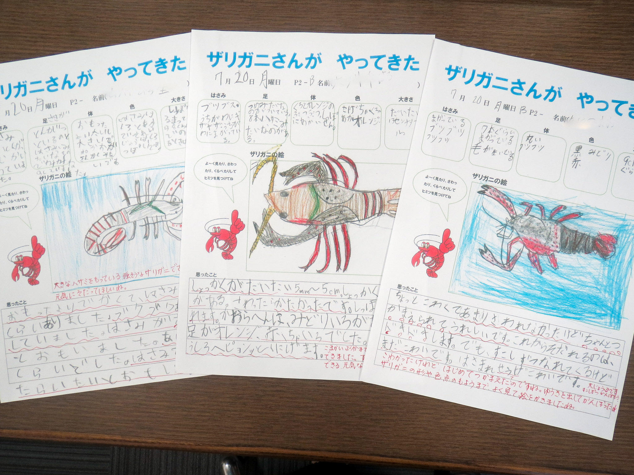 [足]さきがとんがっているのとはさみみたいなもので、カチカチしていました。[体]おもったより太いしおおきいです。かおがさんかくみたいです。[大きさ]しっぽがまるまっていたら8cmくらいで、のびているときは14cmくらいでした。[思ったこと]おもったよりでかくて、はさみが6cmくらいありました。ブクブクあわをだしていました。はさみがするどいとおもいました。…