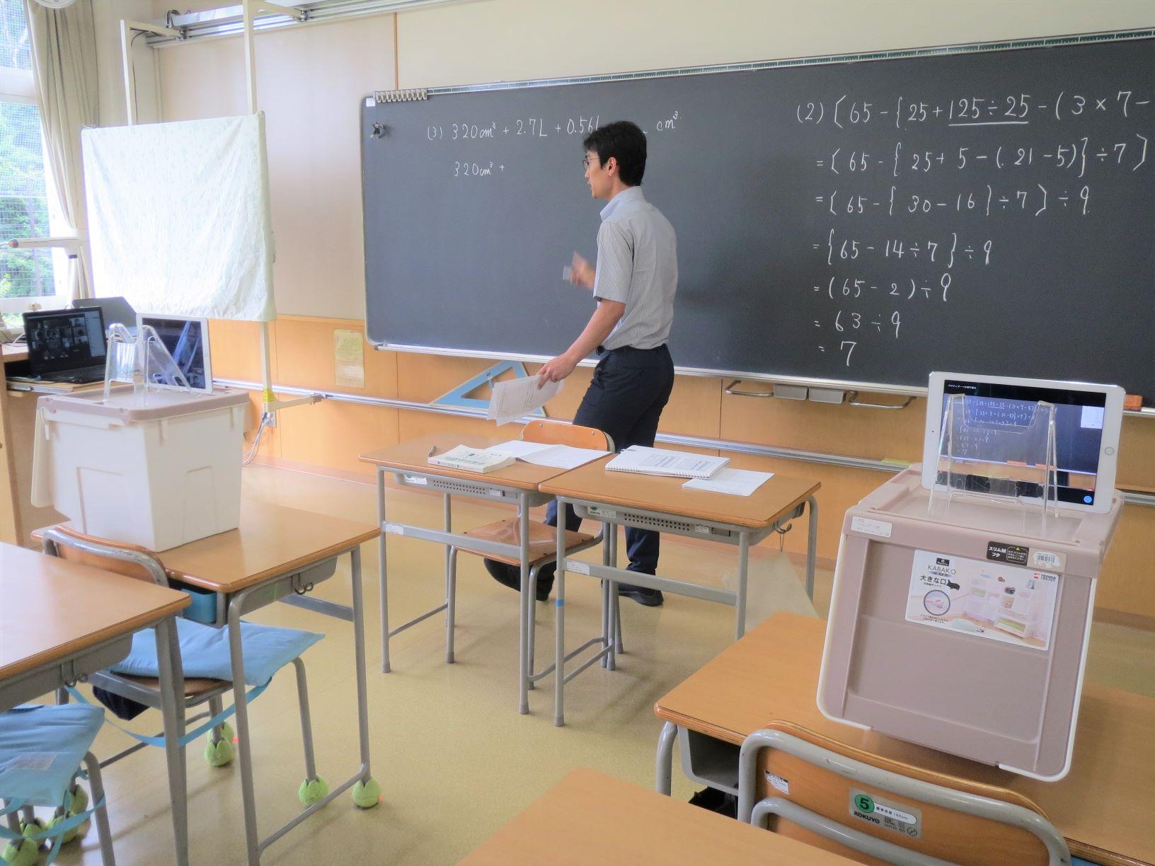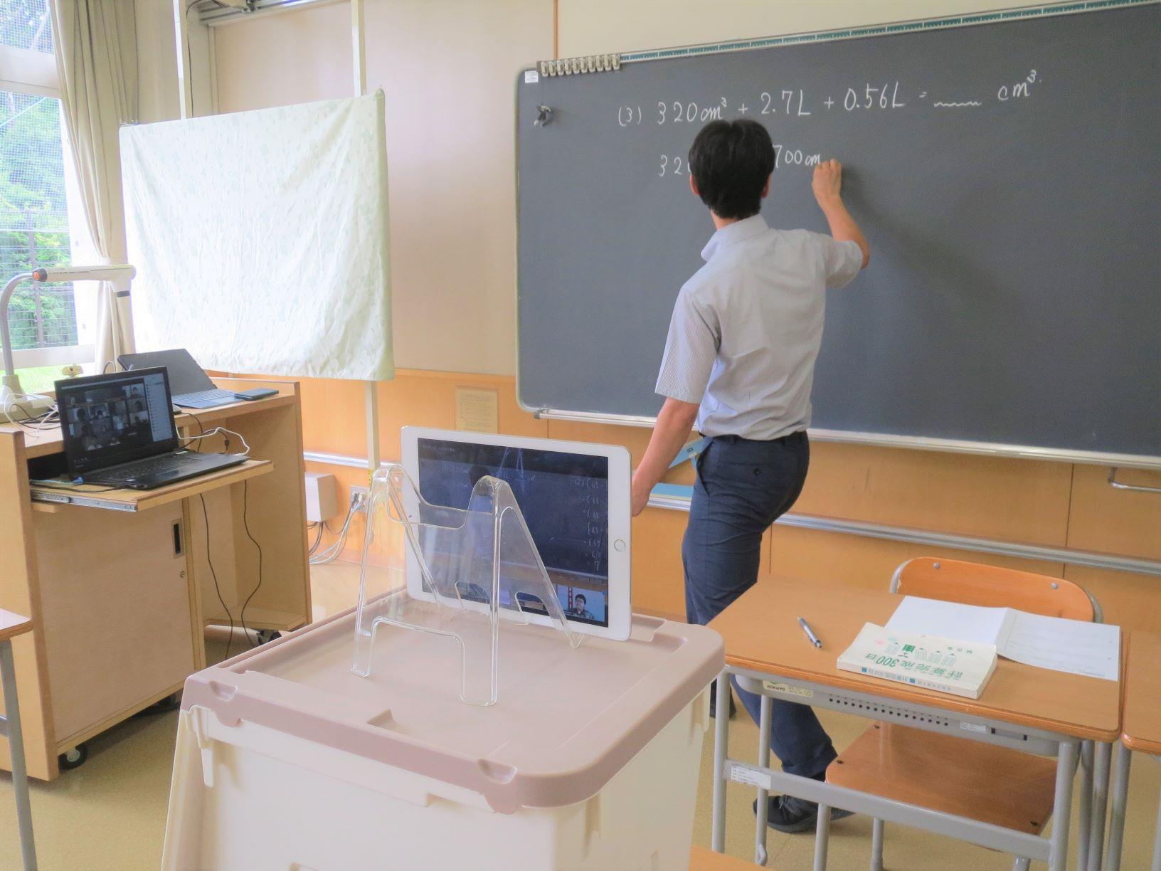 授業の様子を見ていると、黒板を使ったり、タブレットを使ったりしてどんどん説明が進んでいきます。途中で、「はい、◯◯さん、どうですか?」などと指名すると、分割された画面の向こうからそれに答える声。他の子どもたちにも共有されています。