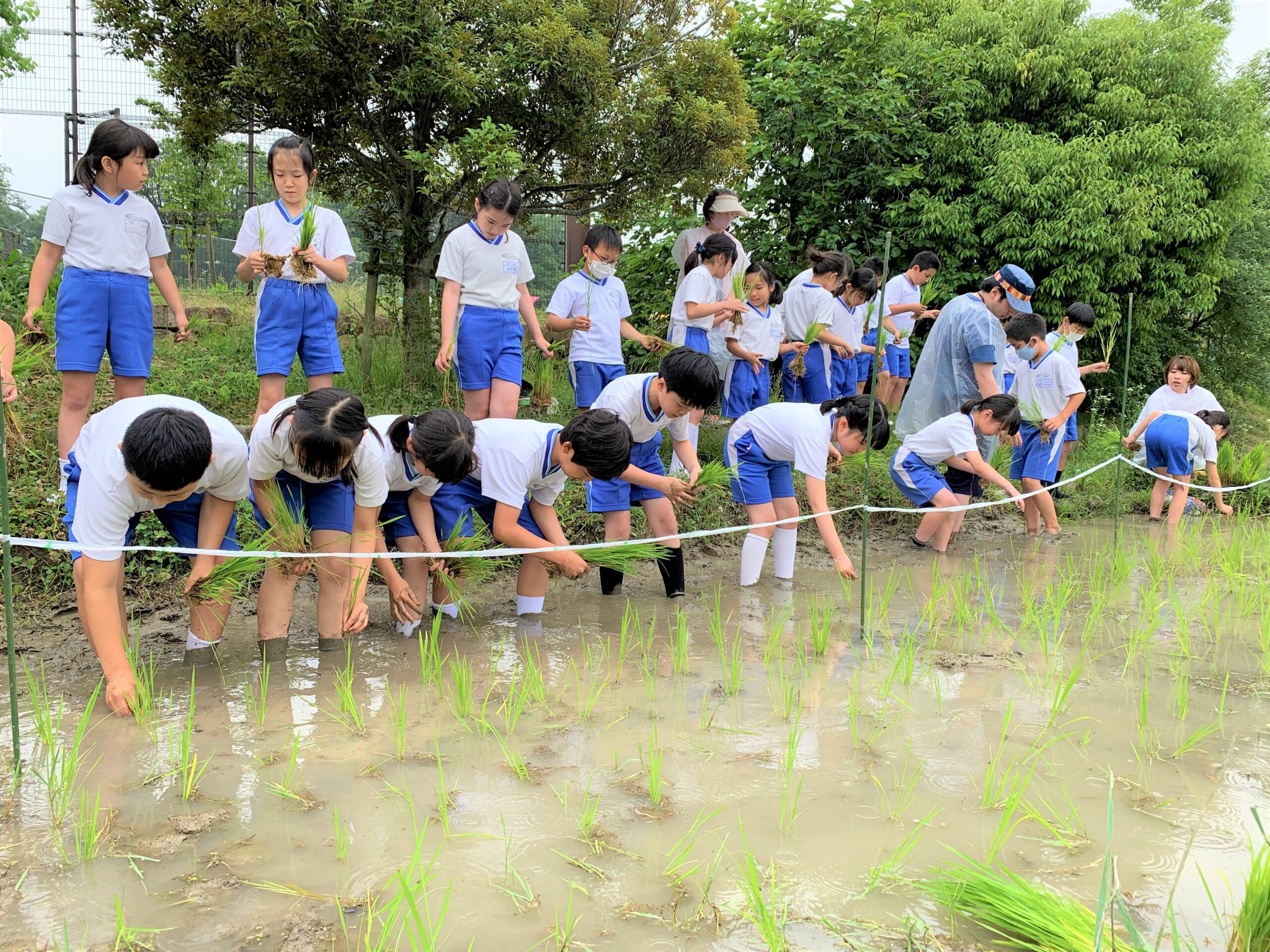 分散登校中のP4(小学4年)A組、B組が、それぞれ登校日に田植えをしました。学年としては、2日間かけて田植えを終えることができました。
