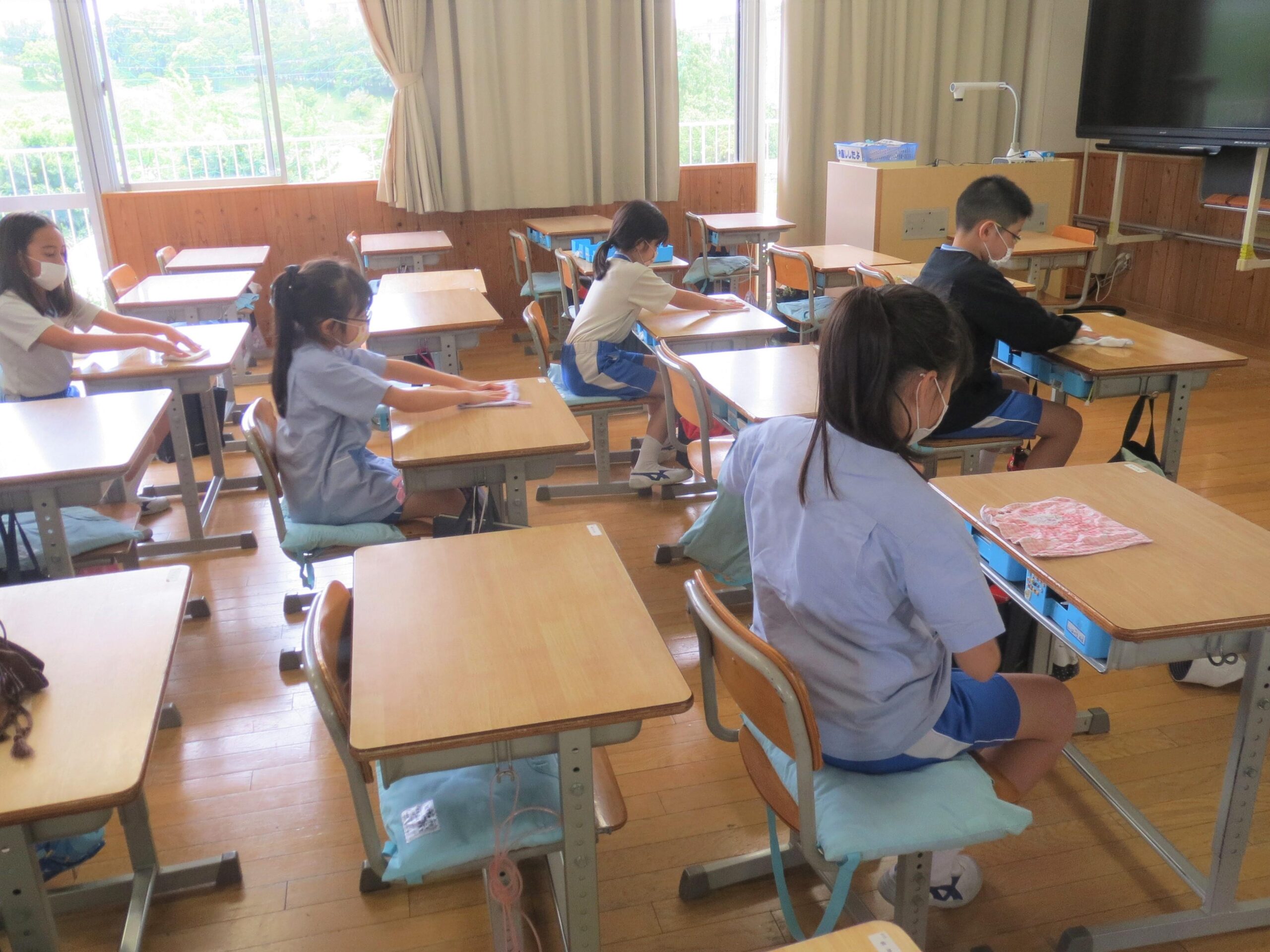 まず、子どもたちはもってきたふきんにアルコールをふってもらい、机の上をふいて消毒します。そして、手を洗った後、子どもたちは座って待ちます。今週は、配膳を教員が全て行い、どのような雰囲気で給食に臨むことが必要なのか、理解させます。その後に、自分たちで整然した状況を作り、給食の準備ができるようにしていきたいと考えています。