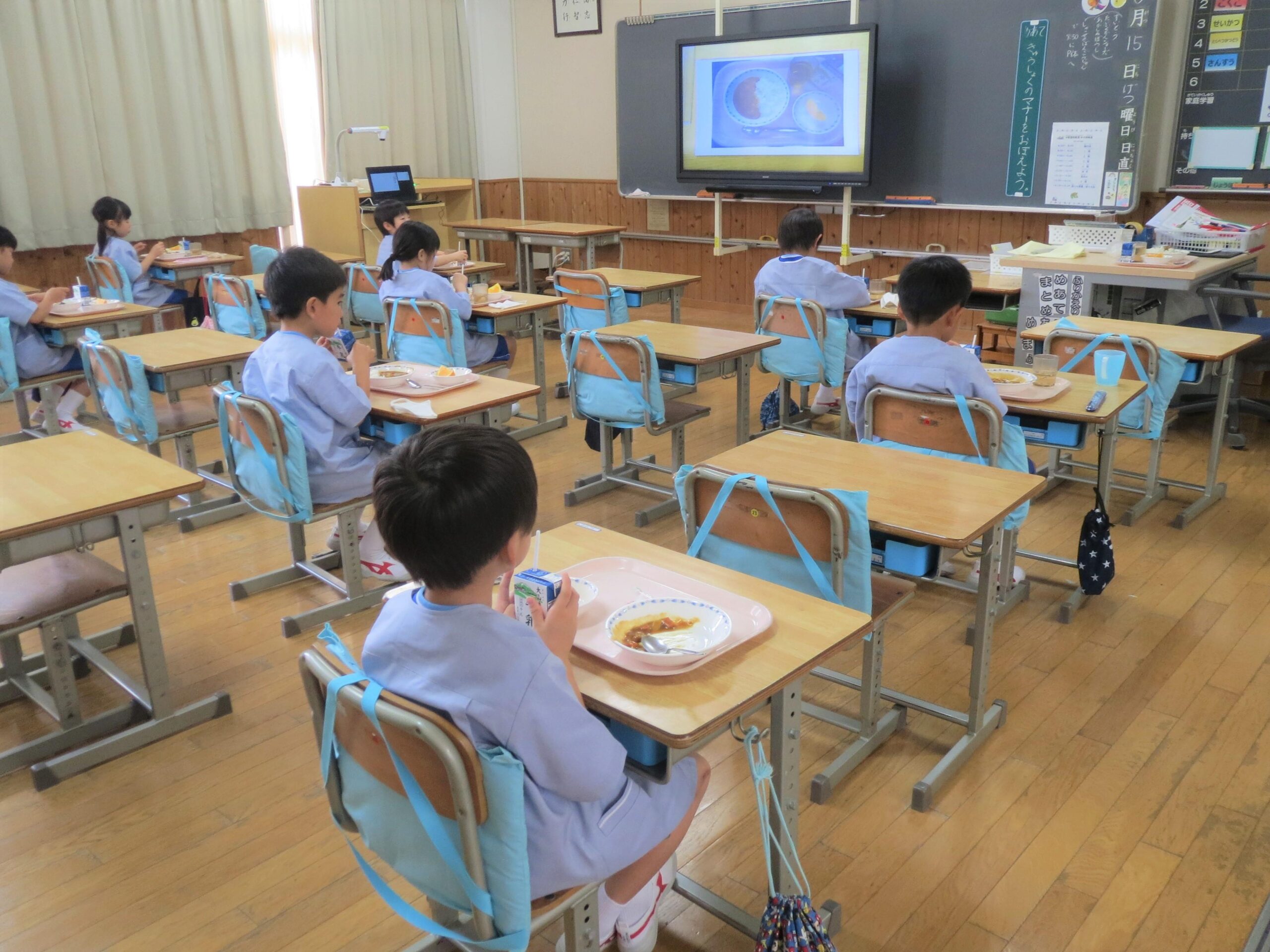 子どもたちにとって、何よりうれしい給食の始まりです。ただ、飛沫感染の防止という観点から、学校では新しい約束をしっかりと作り、教員の指導を徹底しての給食時間となりました。