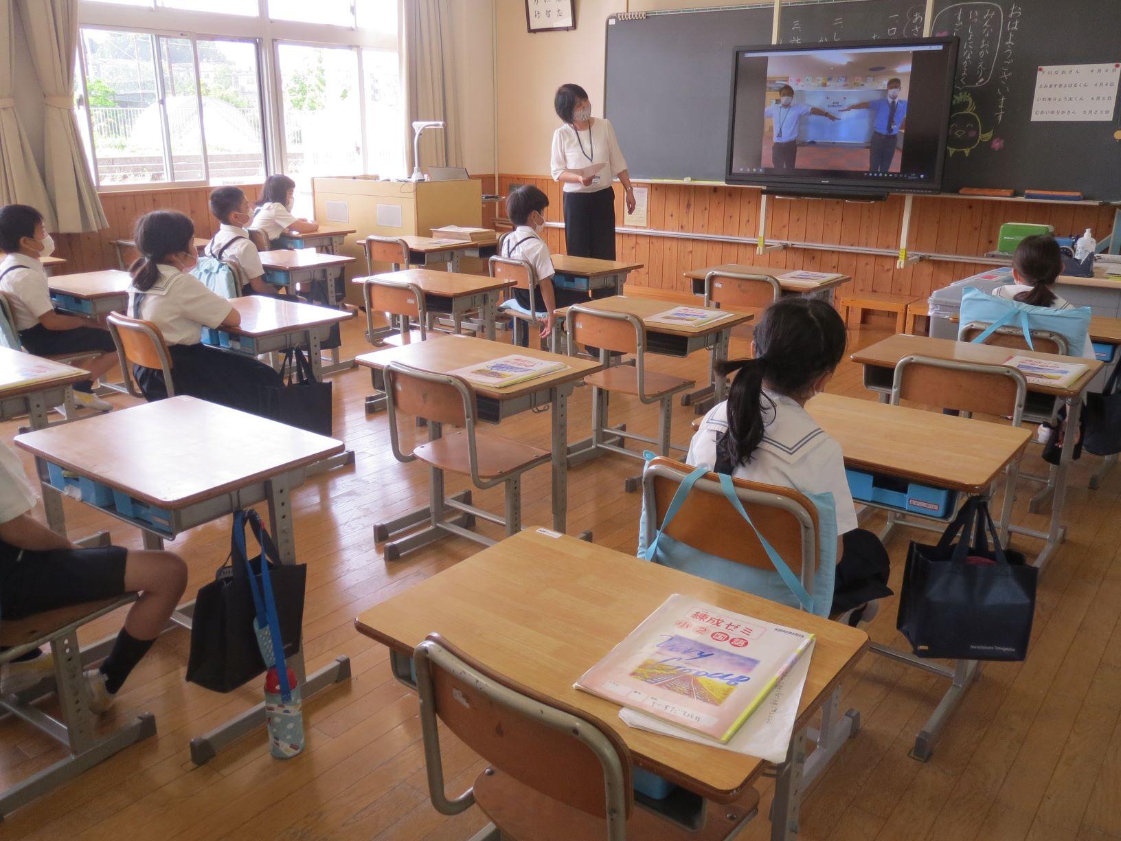 各クラスでは、その後学校の過ごし方の新しい約束を生徒指導担当の教員が作成した動画で確認。全校が同じ動画でルール確認することで、全ての教員が、どの学年の子どもたちにも声がかけられることになります。