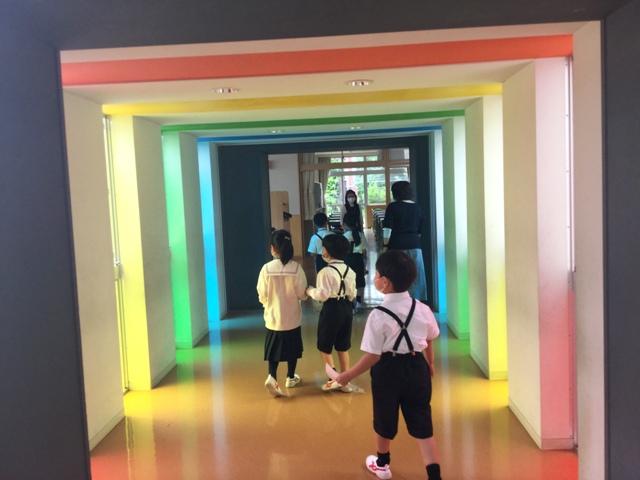 実は、子どもたちはロイロノートで学校の中の説明を全部聞いています。なので、自分が行ってみたいところがある子どもたちなのです。わかりやすい校舎の地図をもちながら、いろいろな部屋に出かけます。職員室や校長室に入るときには「失礼します!」「1年〇組の◯◯◯◯です」と上手に教えてくれます。M2(6年)生の教室に行くには、「にじいろのろうか」を通るのですが、それが楽しみで遠くの教室まで喜んで行くことができました。本当に「たんけん」を楽しんだ子どもたちは、校舎地図にシールやスタンプをたくさん押してもらうことができました。
