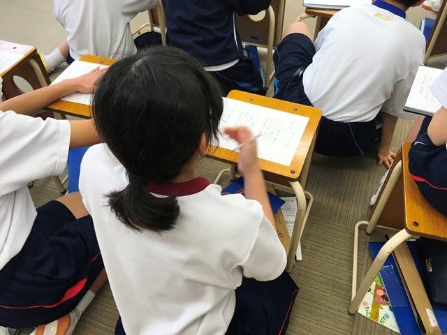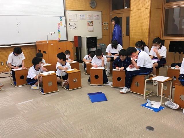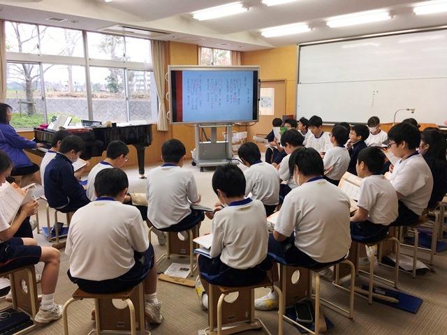 M1(5年生)の音楽の授業では、そんな冬らしさを美しく表現した文部省唱歌「冬げしき」の学習をしていました。歌詞の中には「さ霧(ぎり)消ゆる」「時雨(しぐれ)降りて」など、子どもたちに耳なじみのない言葉がたくさん出てくるため、はじめは穴埋めプリントで歌詞の聴き取りにチャレンジしました。写真だけを見ると音楽の時間に見えないかもしれませんが、歌詞を理解するためにも大切な学習場面です。今ではあまり使われることのなくなった言葉もありますが、こういった曲を通して、日本語の美しさにもふれていく時間となります。