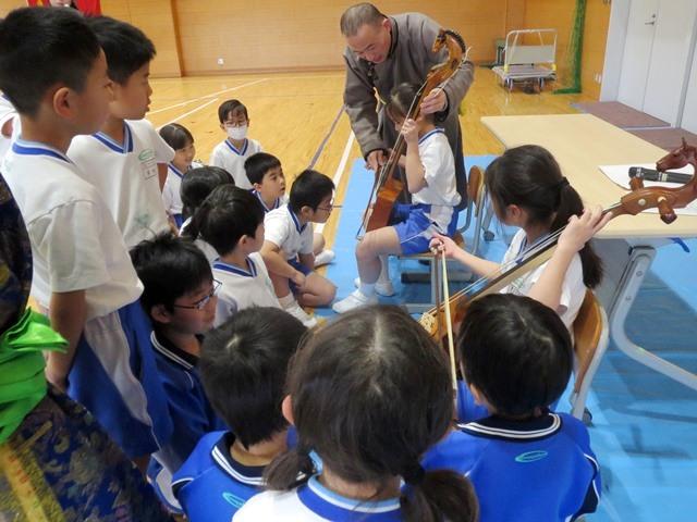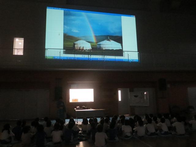 モンゴルの国はどのようなところにあるのか、日本から飛行機で行くと何時間くらいかかるのか、などというお話から説明が始まりました。首都のウランバートルは、大阪よりもっと大きな都会だけど、1時間くらい車で走ると草原を見ることができるし、こんな大きくてきれいな虹が見られるよ…などと子どもたちの関心を引きつけるお話が続いていきました。馬頭琴の演奏もしていただきました。ラクダと馬の鳴き声の違いを音で表したり、競馬の様子の曲を聴かせてもらったり…。じっと聴いていると草原に座って風が頬をなでていくような気持ちになります。