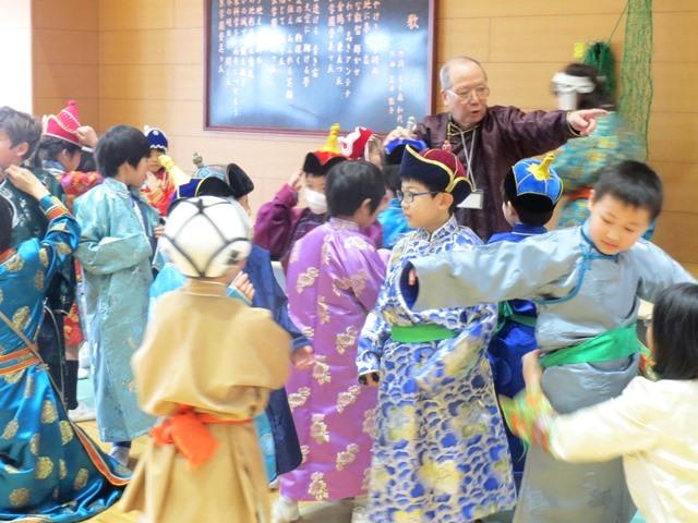 今、P2(小学2年)生は国語で「スーホの白い馬」の勉強をしています。モンゴルの国の中で展開されるこのお話の理解を深めることができるようにと、「モンゴルパートナーシップ研究所」の先生方が奈良学園小学校に来てくださいました。