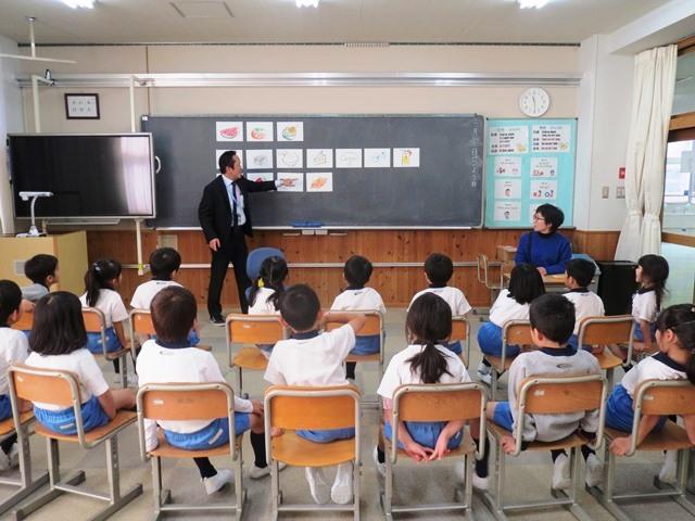 国語の授業では、「しりとりのだいすきなおうさま」という絵本の読み聞かせのあと、一人ひとりが”王様”になって、うまくしりとりになるように自分が好きな食べ物の名前を言います。すると、すぐにその絵が出来上がり!実は、王様の家来として、小学校の図工の教員が即席で絵を描き上げてくれるのです。「王様、これでよろしいでしょうか?」「はい!」という具合に、子どもたちは大喜びです。 しりとりなので、前の食べ物の最後の音から始まる物の名前を一生懸命考えていました。