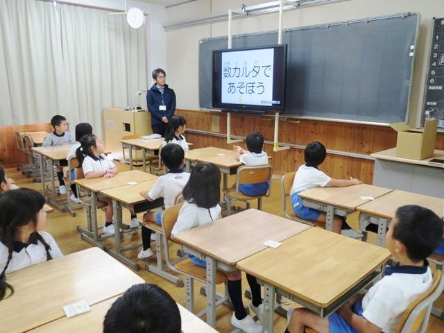 算数の授業では、「数カルタ」を行いました。カルタには、1~9までの数字と黒丸が書かれています。裏向けられたカルタから2枚めくり、その合計が10になれば、その2枚をゲットできるという遊びです。子どもたちはルールをしっかり守ってゲームを楽しんでいました。