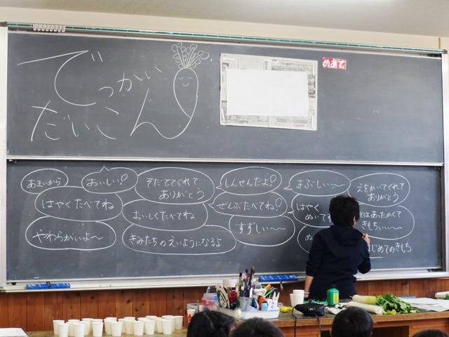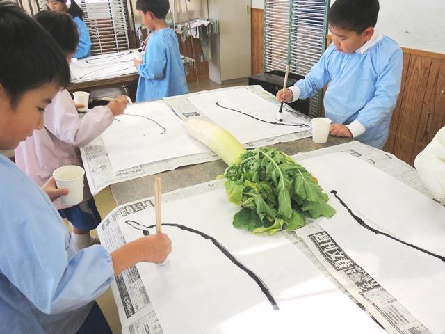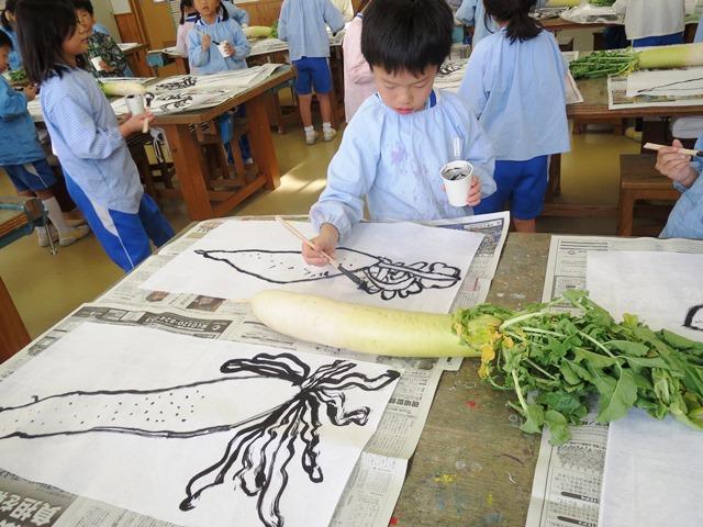 さて、今日の図工室です。子どもたちがその大根を机の上に置いて、大きな画仙紙にタオルペンで大根を描き始めました。まず、大根の気持ちを考えると…「はやくたべてね」「しんせんだよ」「まぶしい~」「おいしい!」「ぜんぶたべてね」「そだててくれてありがとう」などなど、たくさんの気持ちが子どもたちからはあふれるように出てきました。