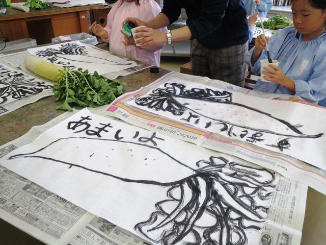 そして、画仙紙におそるおそる、でも大胆に筆を進め、でっかい大根が表れてきました。葉っぱも画仙紙からはみ出んばかりに描き加えられます。画仙紙に残った場所には、「大根の気持ち」がこれまたタオルペンで大胆に書かれました。でっかい大根と出会った子どもたちの喜びが、表現として形に表れてくる時間です。
