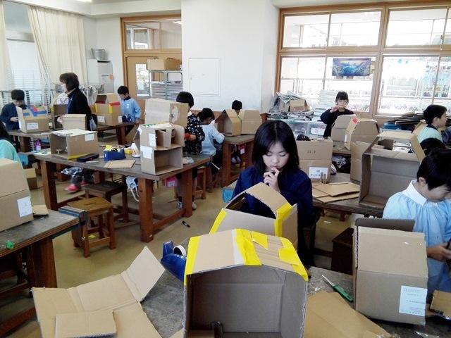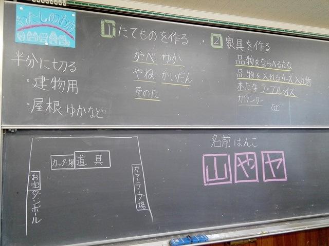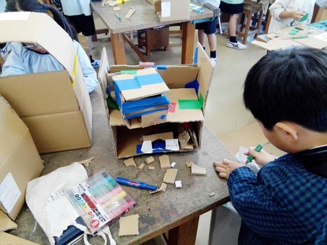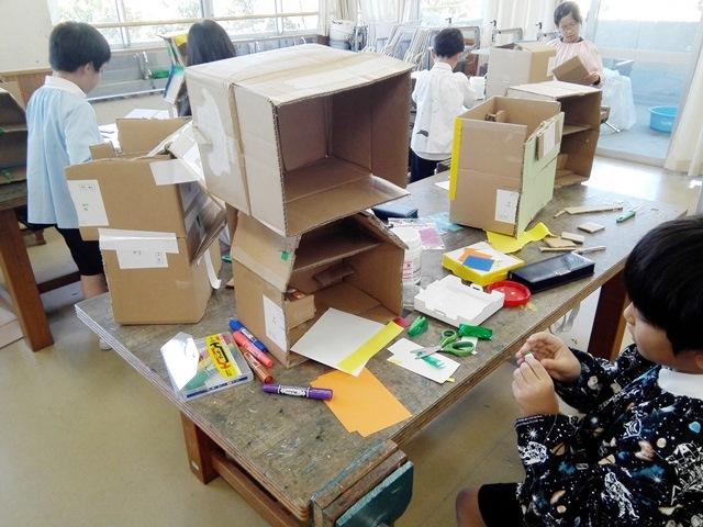 「わたしのお店」と題して、段ボールや画用紙をカッターナイフなどで切り、屋根や壁、家具や陳列棚を作ります。みんなが作っている様子を見回ってみると、階段を作るのが想像以上に難しいようで、階段が下まで届かずに思案顔の子もちらほらです。