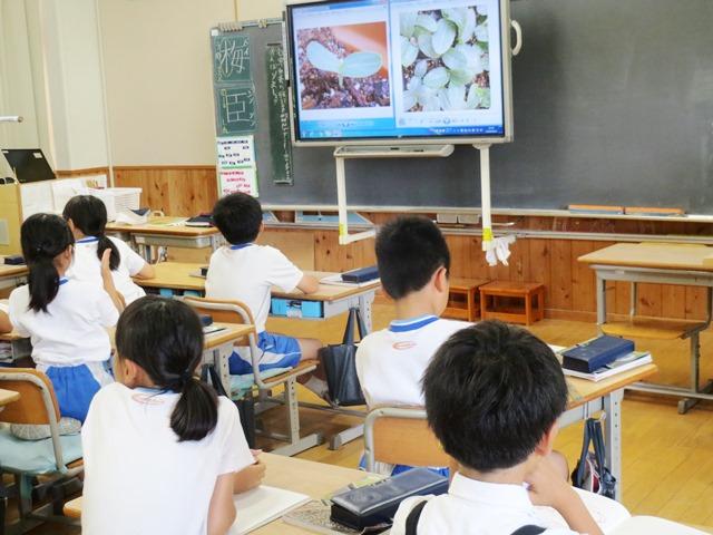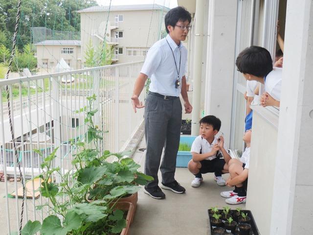 P4(小学4年)生の教室横のベランダで、おもちゃカボチャを育てています。理科の学習で成長の様子を観察しているのです。教室が2階にあるために、畑まですぐに行きにくいという環境を、ベランダを活用することでカバーしているのです。