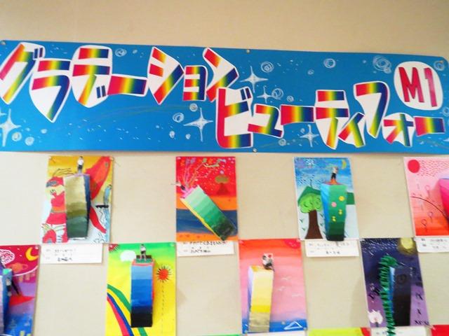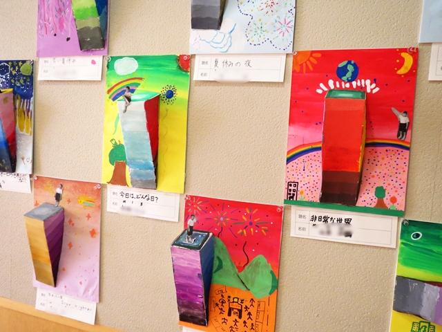 廊下に掲示された作品には、「夕焼けで元気をもらおう」「明日の自分へ」「非日常な世界」など、一つ一つにとてもユニークな表題が付けられており、思わず足を止めてその子どもの世界に思いを馳せながら見入ってしまいます。