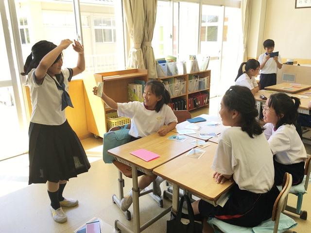 5月、M1(小学5年)生の図工の時間、「アートカードゲーム」の学習では、自分がひいたカードに描かれた名画や写真について、ことばを使わずにジェスチャーで友だちに伝え、それを当てられるかというゲームをしながら、カードから受けた自分の印象を動きやポーズなど工夫して友だちに伝えていました。この学習を通して、作品の見方に対する理解が深まっていきます。ここで学んだことは、次の「グラデーションビューティフォー」の学習にもつながっていきます。