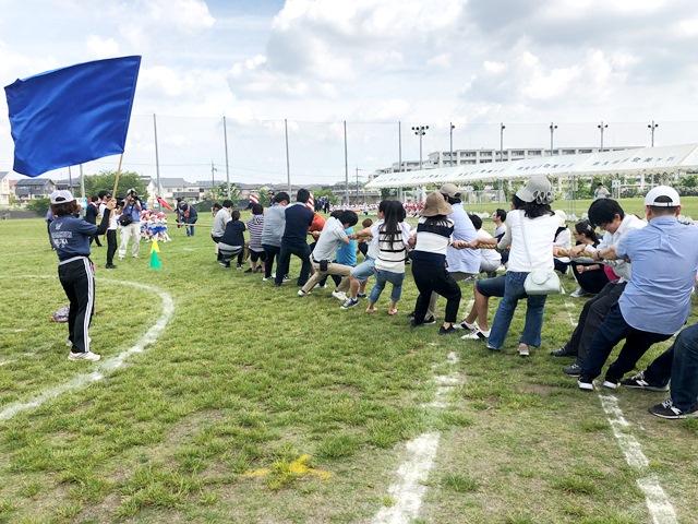 P4生の親子競技は「親子対抗つなひき」でした。P4生全員と1クラスの保護者が勝負します。どうなることやらと、近くで応援をしていましたが、保護者の方々も「負けられません!」と並び方を工夫するなどの作戦を立てての対戦です。白熱してどちらともいえない引き合いの時もあるのですが、結局保護者チームの勝ち…。勝負はそんなに甘くはありませんでした。でも、子どもたちからは、手抜きをしない保護者の方々の力を認めた笑顔が見られました。