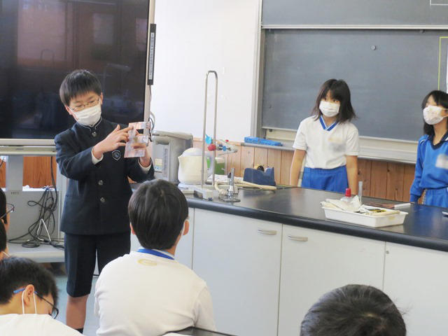切り込みが入った金属の端を熱源として暖めると、熱はどのように伝わっていくのか、一人一人が伝わり方をどのように予想したのか、まず伝えます。次に、各グループで相談して決めた実験方法はどうだったのか、どのような材料を使ったのかも説明をします。さらに結果がどうだったのか、そのことに対してどのように考えたのか、ということまで3分間でグループ全員4人が力を合わせて発表する、という流れでした。