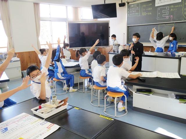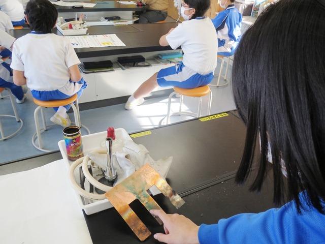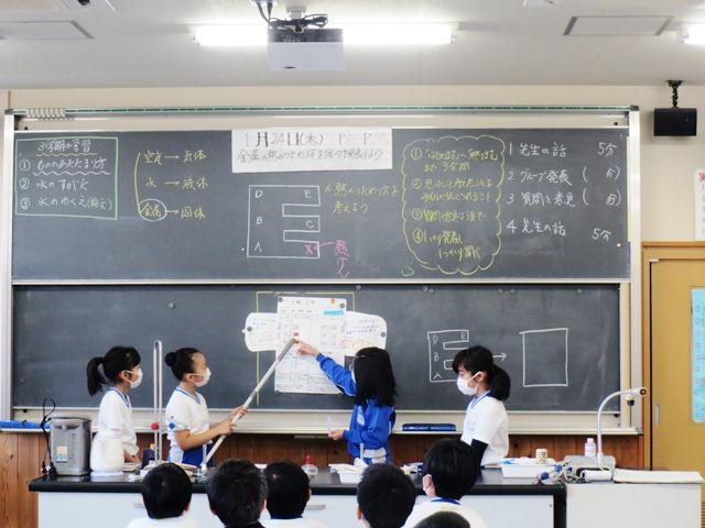 実験はグループでいっしょに行ったけど、実験結果に対する考察は、一人一人が自分の言葉で述べていきます。例えば、「熱の伝わり方は、切り込んで残った金属が太いか細いかということが関係していると思ったけど、熱源からの距離が関係していると分かりました」などというように、自分の予想と比べてどうだったのか、考察を発表してくれていました。他のグループの発表をとても真剣なまなざしで聴く子どもたちでした。
