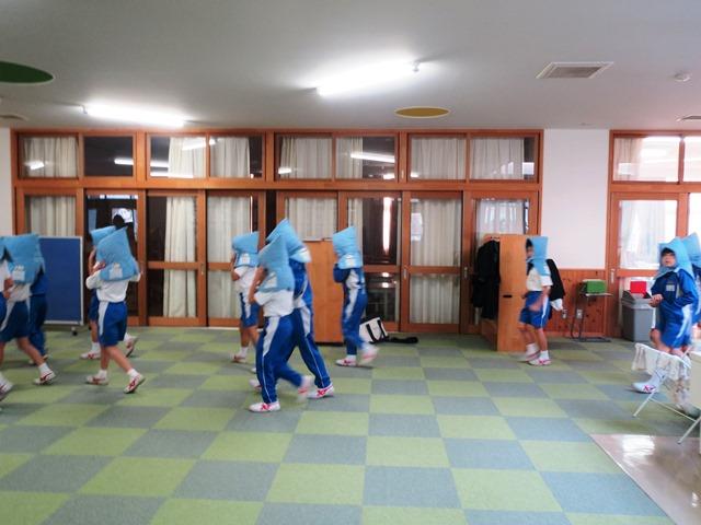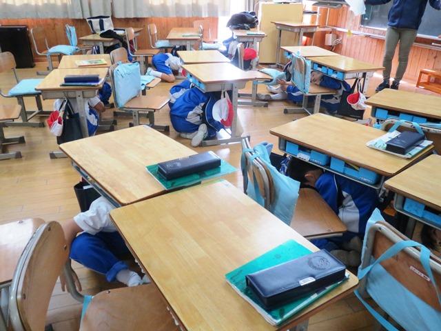 朝の会の時間、特に小学校の低学年の各クラスでは、避難訓練のことについて学級指導を行いました。なぜこのような訓練をするのか、地震が来たときにどのように備えるのか、どのように避難するのか、避難するときは何に気をつけて移動するのか、学校ではどこに集まることになっているのか…。毎回指導していることですが、いざというときに自分で自分の身体を守ることができるようになるまで繰り返すのが訓練です。1年生のクラスでは、頭を守るために机の下に入ってどこを持っていればよいのか、などという事前指導も行いました。