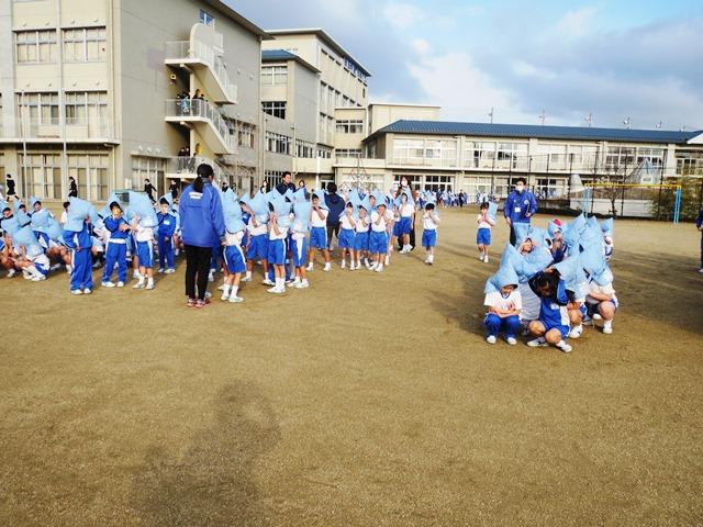 避難してP生はPグラウンドに、MY生はMYグラウンドに集まりました。訓練について振り返った後に、明日1月17日が阪神淡路大震災の起こった日、東日本大震災も8年前の3月11日であることから、全員が黙祷をして亡くなられた方々に思いを届けました。昨年6月に起こった大阪府北部地震は全員の記憶にも新しいことから、子どもたちはみんな真剣に訓練に臨んでいました。繰り返し行う体験を通して力をつけていけるようにしていきたいと考えています。