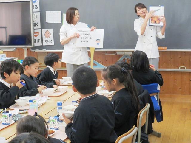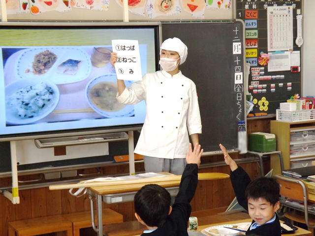 「今日の献立に使ってあるゴボウですが、ゴボウは①はっぱ ②ねっこ ③実 の中でどれでしょう」……「正解はねっこです」といった具合に、食材について興味の持てる話をしていただき、興味深く話を聞くことができました。