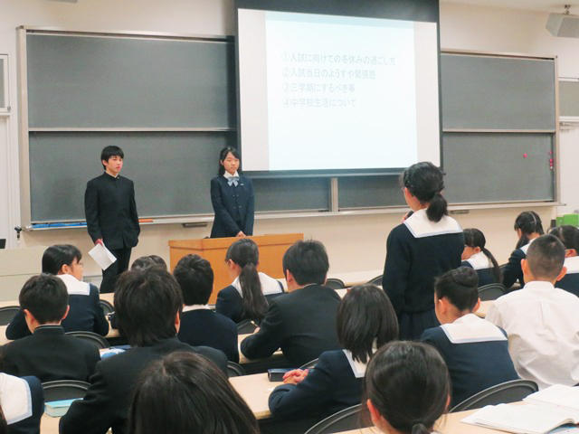 Y1(中3)生2人がM1生にも語ってくれました。子どもたちの感想から語りの内容を見てみると…。「今日は、Y1生から中学校生活や中間・期末の勉強方法などを教えてもらいました。今まで困っていたことなどが分かったので、すごくいい機会でした。これからも、当たり前のことを当たり前にすること、まじめにコツコツを大切にしてがんばっていきたいです」「特に叡智ノートと定期考査計画表の話が心に残りました。叡智ノートも計画表も適当に書いていたけれど、きちんと書けばグンと成績も上がると思います。お兄さん、お姉さんの話を活かして三学期はちゃんとできるようにしたいです」