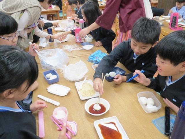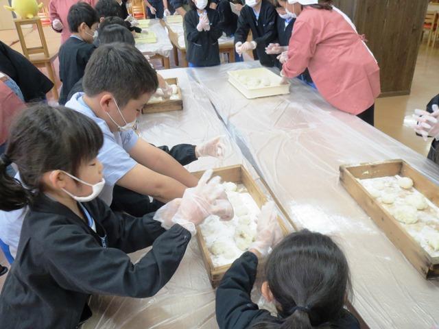 引き続いて餅つき。臼も杵も子どもたちにとってはなじみのないものですが、登翔会(育友会)の協力もいただきながら、全員が餅をつきました。足を前後して力を入れる、などということも体験したことがなければわかりにくいようで、お互いに声をかけ合いながら3つの臼を囲み、順番に杵を手にしていきます。何回かついているうちにコツをつかんだ子どもたち。充分に柔らかい餅ができあがりました。柔らかい間に急いで丸める作業をする表情は、全員笑顔です。