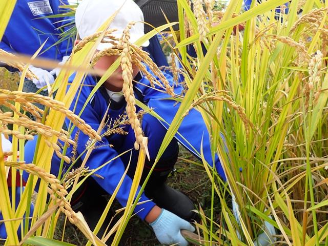 春、P4(小学4)生は、校舎内にある棚田に田植えを行いました。社会科で学ぶ米作りや理科で学ぶ植物の生長とも関連させながら、育ちを楽しみにして見守ってきました。10月30日にはいよいよ稲刈り。かまを持ったことのない子どもたちが片手で稲をつかみながら刈り取る体験をしました。刈った稲はすぐにコンバインに運び、ご指導いただいている「ならグリーンファーム」の飯田さんに手助けしていただきながらコンバインに吸い込まれていきます。脱穀され、籾と藁に分かれて出てきた籾に思わず歓声があがります。袋の中に入った籾を、手ですくい自分たちが植えて育てて実ったお米の感触を味わった子どもたちです。