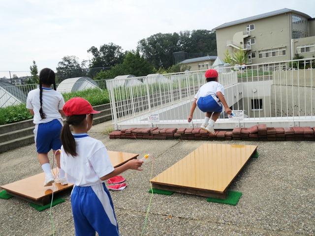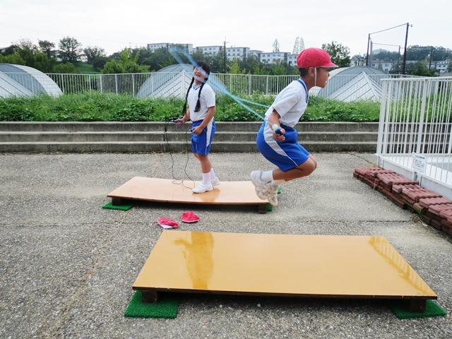 「『なわとび板』の上で飛ぶと、随分簡単に、高く跳ぶことができます」と説明があったことを、試しながら実感してくれています。跳んでいる間に、二重跳びにチャレンジしたり、考査跳びにチャレンジしたり、今までより回数多く跳んだり…。並んでいる子どもたちに聞くと、「二重跳びを跳べる回数が増えました」「高く跳べるから跳びやすいです」などという話をしてくれました。まだまだ暑さは残る気候ではありますが、汗を流しながら挑み続ける子どもたちを見ていると、誇らしい気持ちになってきます。