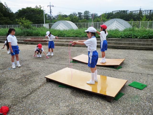 朝の外遊びの時間や休み時間、毎日「なわとび板」に子どもたちがチャレンジしています。この「なわとび板」は、夏休みの間に2年生の先生たちが手作りをして、2学期の始業式に子どもたちに紹介したものです。