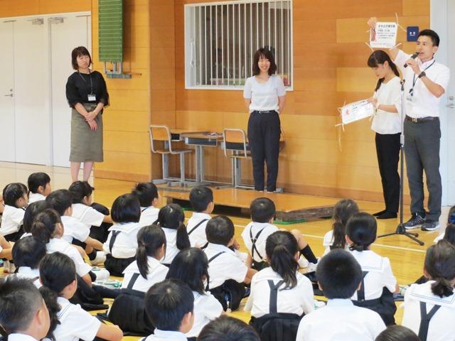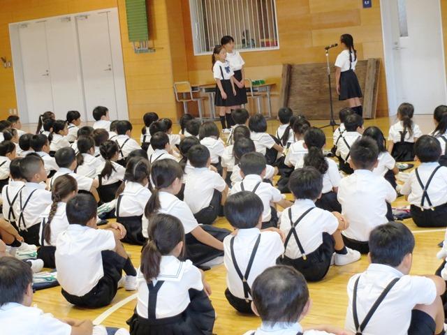 始業式では、三つのがんばることを話しました。一つ目は、勉強。自分ががんばることだけでなく、友だちの意見を聞いてさらに考えることをしましょう、と呼びかけました。二つ目は、仕事。そうじ、日直、給食、係、委員会など、たくさんある仕事をする場で一生懸命できる人は、責任ある人です。仕事が一生懸命できる人になりましょう、と伝えました。三つ目は、友だち。一年の中で一番長い2学期の間に友だちとけんかをしたりいやな気持ちになったりすることがきっとあるけど、ちゃんと自分で解決していける力をつけましょう。難しいときには、先生がしっかりと助けてくれます。学校の一番素晴らしいところは、友だちと一緒に生活できるということです。仲良く力を合わせる2学期にしていきましょう、と言いました。どの子どもたちもしっかりと目を向けて話を聞くことができていて、そのこともほめました。