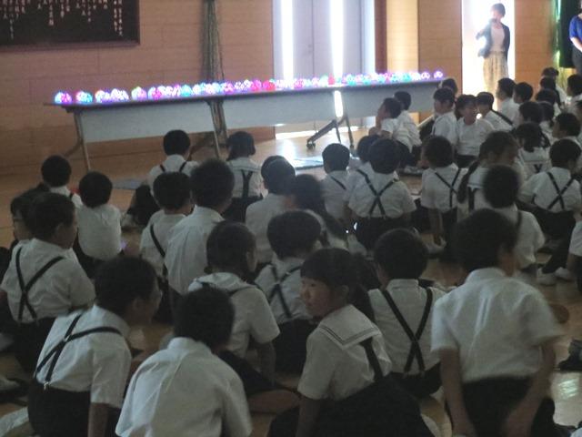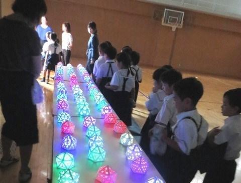体育館の電気がだんだん暗くなり、灯篭の七色の明かりが浮かび上がると、「わあ、きれい!」という声があちらこちらで聞こえて、しばらくみんなで見つめていました。明日からの夏休みのことを思ったり、こんな灯篭を自分も作ってみたいと思ったり…。体育館から各クラスに、子どもたちは名残惜しそうに灯篭を見つめながら帰って行きました。