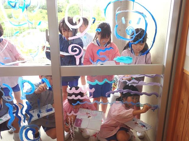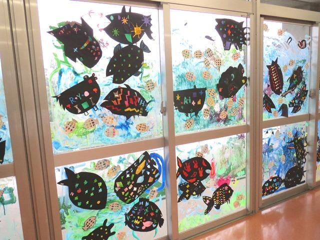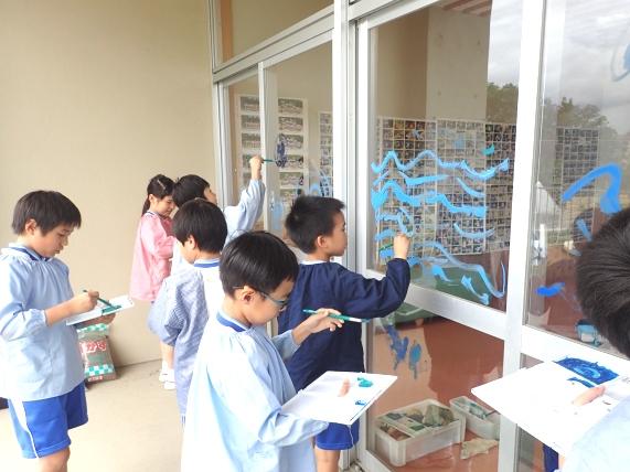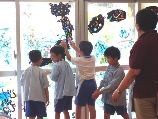 2階のアメニティホールの窓ガラスの外側に魔法の水(洗剤を溶かした水)で絵の具を溶いて、筆や指、手を使って海を表現していきます。「窓に絵の具で描いてもいいの?」と心配しながら、大丈夫だとわかれば夢中になって海を描いていく子どもたち。その次に、窓ガラスの内側から以前に制作していた「海の生き物」を貼りました。A組、B組がガラスの半分ずつを分担して仕上げていきました。海の表現もそうですが、「海の生き物」をどこに貼るのかも、自分で観たり友達と相談したりしながら貼り付けていきました。出来上がった水族館はとてもきれいで、思わず足を止めて見入ってしまいます。