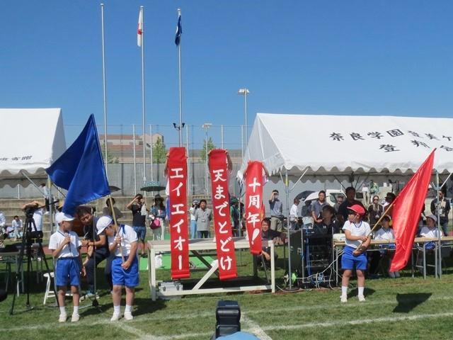 6月2日(土)、梅雨入り前の青空に恵まれ、プライマリースポーツフェスタを開催しました。今年は、奈良学園が創立10周年ということもあり、選手宣誓のあとに全員で「10周年、天までとどけ エイエイオー!」のかけ声をかけスポーツフェスタの始まりです。