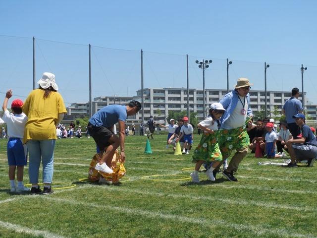 子どもたちが何より楽しみに臨んだのが保護者の方との団体競技です。2人3脚(P4:息の合わせ方が難しいです!)や台風の目(P3:コーンを曲がるときの息の合わせ方が、以外と難しいのです…)、デカパンリレー(P2:大きなパンツに二人で入り走りますが、焦れば焦るほどパンツがはきにくくなります!)、あっちこっち!なとみん(P1:4人が力を合わせて「なとみん」を運びますが、大人が焦っても「なとみん」が落ちてしまうと拾って台に乗せるのは子どもたちです!)では、目を輝かせながら競技に参加する子どもたちでした。保護者の皆様のご協力に感謝です。