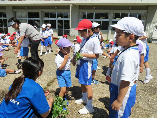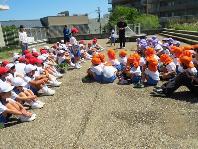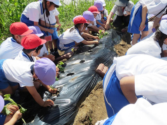 一緒に頑張って植えて秋には大きなサツマイモを収穫しましょう、とP2生からのあいさつがありました。いよいよペアが一緒に苗をもらい、自分たちが土に植える場所にやってきます。小さい幼稚園のペアに苗を持たせている子やそっと一緒に持っている子どもたちです。自分自身も畑で苗を植えるなどという体験は少ないうえに、小さい友だちと一緒に作業するわけですから、P2生にとっては精一杯の動きの時間となりました。どの向きに苗を植えて、どうやって土をかぶせればよいのか、先生の話をしっかり聞いて作業し、植えることができました。