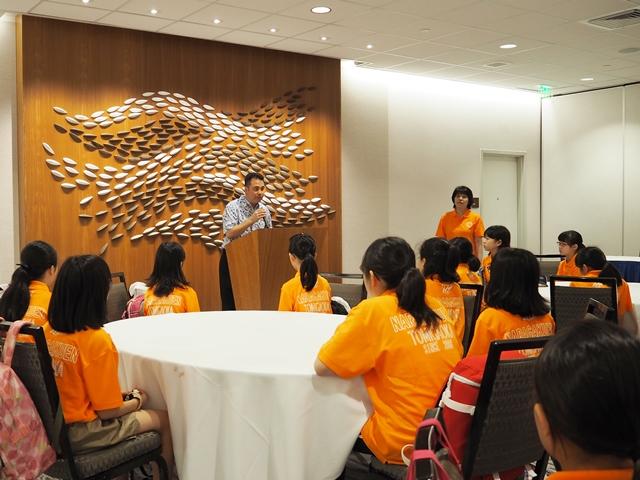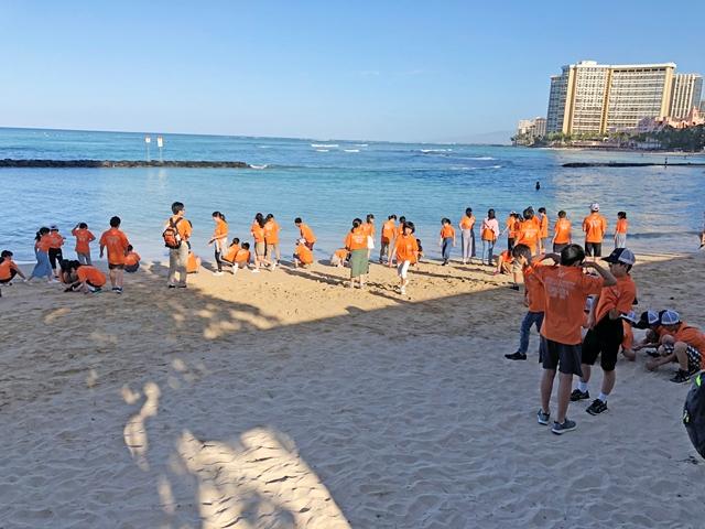 楽しかったハワイでの最終日。最後の朝礼は、優しい波の音が聞こえ、心地よい風の吹くワイキキビーチで行いました。せっかくなので、砂浜で少し遊ぶ時間もとりました。6日目の朝も体調を崩す子はおらず、元気いっぱいです。ハワイ宿泊学習でお世話になったアロヒラニリゾートワイキキビーチホテルでの閉宿式でも英語で立派にお礼を伝えることができました。