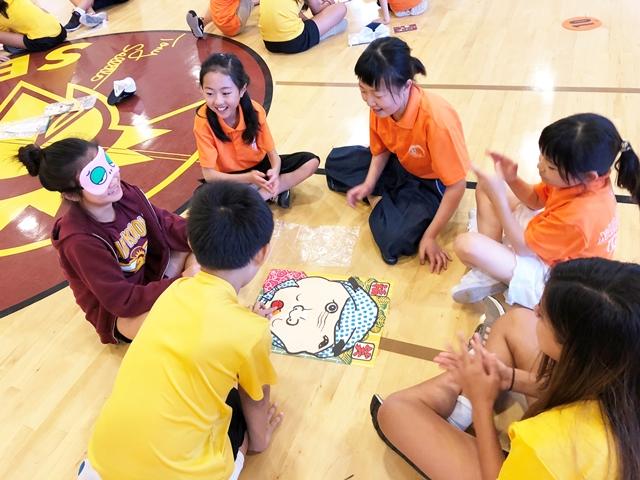 M2生のメリノール校訪問2日目。まず、日本の伝統の遊びをグループに分かれて紹介しました。今回紹介するのは、「コマ、竹とんぼ」「紙しばい」「福笑い」「とんとん相撲」「あやとり」「紙風船、折り紙」の6つのグループです。自分たちにはなじみのものも、英語で伝えようとするとなかなか難しいようでした。それでもなんとか意図を伝えようと準備をし、よく頑張っていました。