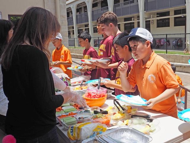 昼食は、メリノール校の児童の保護者の方々が持ち寄りで用意してくださいました。焼きそばやチキン、ピザなど、盛りだくさんの食事を、ペアで一緒にいただきました。児童はそれぞれのペアで一緒に食べ、最後の交流を名残おしんでいるようでした。今までたくさんの準備をしてきて、やっと会えたメリノール校のみんなとのお別れのとき。