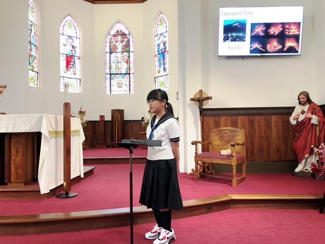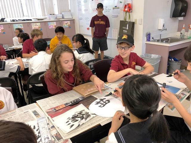 1日目。最初は校内にあるチャペルで日本の文化の紹介です。一人ずつ前に出て、練習してきた英語で紹介しました。子どもたちの言葉もはっきりしていてとてもわかりやすかった、という感想をいただきました。みんな、緊張しながらもよく頑張りました! 次に、ペアごとに分かれての交流です。日本から持って行ったうちわに、筆で漢字一字を書き、プレゼントしました。漢字の意味も頑張って伝え、交流を持っていました。ペアの子もとても喜んでくれていました。活動後はみんなで一緒にピザランチ。ペア同士で集まって、おいしくいただきました。