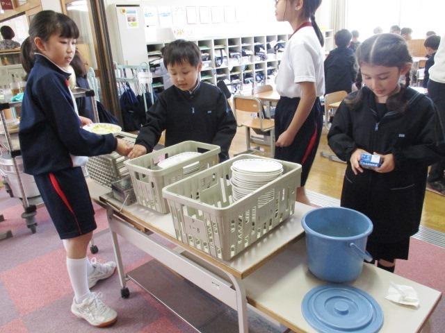 朝、教室にきて、登校してきたP1生に話しかけたり、かばんから教科書を出す手伝いをしたり、一緒にオープンフロアで遊んだり…。何よりの時間です。給食の時間も、グループにM2生が入って一緒に食べています。