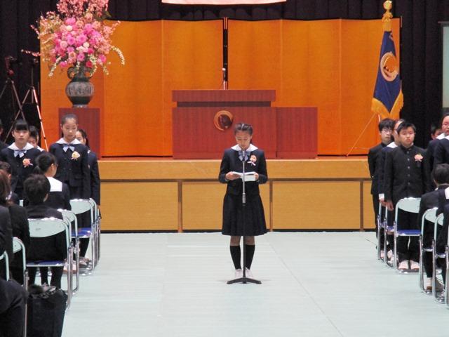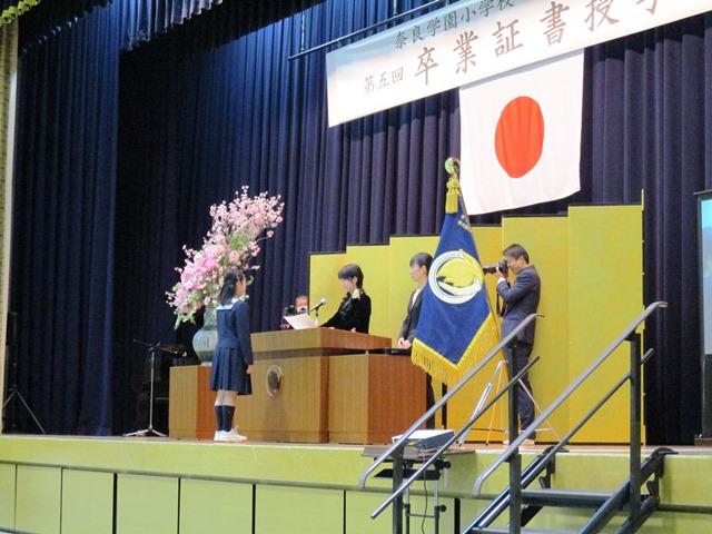 子どもたちには、次のような言葉を伝えました。「今年、韓国の平昌(ピョンチャン)ではオリンピック・パラリンピックが行われています。…その中でも、銅メダルをとった女子カーリングチームのことは、マスコミでも多く取りあげられたので、皆さんの中でも関心を持っている人がいるのではないかと思います。でも、メダリスト、という言葉からは華やかな雰囲気を感じますが、彼女たちの競技生活は決して恵まれた環境であったわけではありません。『自分たちを信じてやっていけばメダル獲得も夢ではないと思い続けて最後までやった結果、銅メダルを持って帰ってくることができた』『一人一人が口に出せず秘めていた夢が、5人集まると目標になり、一つの現実になった。限界は人が決めることではなく、自分自身でしっかり乗り越えていくものだと思う』こんな一人一人の言葉からは、数々の困難を乗り越えてきた重みを感じます。人生の分かれ道に立った時、やめてしまうのか、続けるのか、右に行くのか、左を選ぶのかは、みなさん一人一人が考えて選んで生きていかなければなりません。選んだ結果は、一人一人の責任です。自分は何を考えているのか、何をしようとしているのか、自分で自分をしっかり見つめる力を持つことで、人生の岐路に立った時、自信をもって人としてより良く生きる自分の道を選ぶことができるのです。そんなとき校訓である『尚志』高い志を持ち、『仁智』思いやりの心と知恵と、『力行』あきらめずにやり遂げる、という強い意志を持って臨んでいれば、その姿を見ている人、それを応援してくれる人が必ずいます。…奈良学園小学校を卒業しても、私たちは皆さんを応援し続けます。」